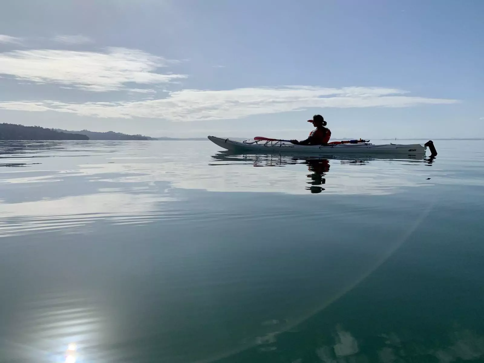 So what have we been doing? Well this weekend was stunning, the tides perfect, no wind, no wave… So Water Nomads dusted off the sea kayaks for a local paddle on the Manukau. As you can see it was mirror calm, winter warm sun, blue day. Entertainment included Bevan disturbing a basking Ray in the shallows where the water boiled as it startled drenching him in a shower of sea water! A calm evening looking out over the Manukau heads, warmed by the setting sun, while whipping up a vege Thai curry and a hearty red wine.